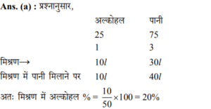 एक 40 लीटर मिश्रण में 25% अल्कोहल और 75% पानी है। यदि मिश्रण में 10 लीटर पानी मिलाया जाता है, तो नए मिश्रण में अल्कोहल का प्रतिशत क्या होगा ?