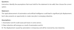 The statement clearly assumes that automation and AI can cause job losses (Assumption I) and that new industries will emerge creating new jobs (Assumption II). There is no assumption in the statement that job displacement will be temporary or fully reversed, so Assumption III is not implicit.