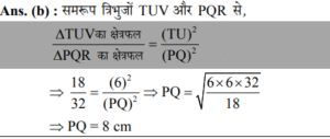 दो समरूप त्रिभुजों TUV और PQR का क्षेत्रफल क्रमशः 18 cm² और 32 cm² है। TU = 6 cm है, तो PQ बराबर ____ होगा।