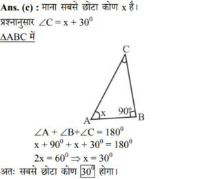 यदि किसी समकोण त्रिभुज के एक कोण की माप सबसे छोटे कोण की माप से 30° अधिक है, तो सबसे छोटे कोण की माप …………… है।