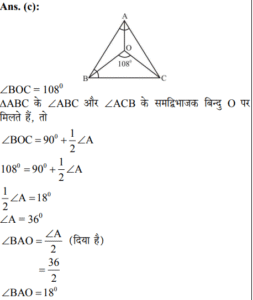 ΔABC में, ∠B और ∠A के समद्विभाजकों का प्रतिच्छेदन बिन्दु O है। यदि ∠BOC = 108° है, तो ∠BAO का माप क्या होगा ?
