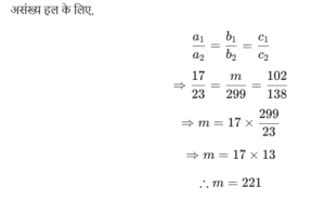निम्नलिखित में से m के किस मान से समीकरण निकाय 17x + my + 102 = 0 और 23x + 299y + 138 = 0 के असंख्य हल प्राप्त होंगे ?