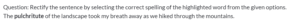 Correct spelling with meaning : “Pulchritude” means great physical beauty or attractiveness, often used in a literary or formal sense. In the sentence, it correctly describes the breathtaking beauty of the landscape.