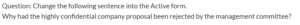 The given sentence is an interrogative in passive voice: “had been rejected by the management committee.” The tense is past perfect (had + V3). To convert into active voice, we make the agent “management committee” the subject and keep the same tense and question structure.