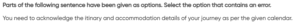 Corrected sentence: You need to acknowledge the itinerary and accommodation details of your journey as per the given calendar.